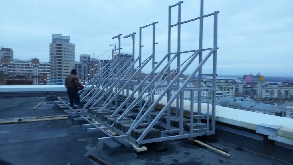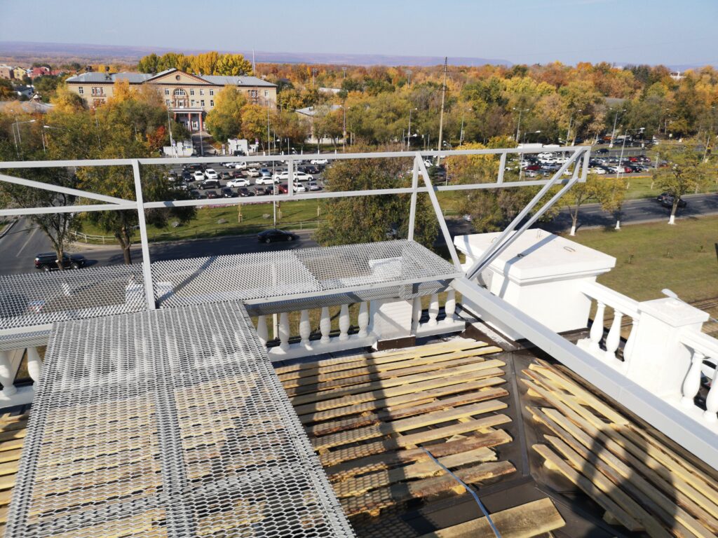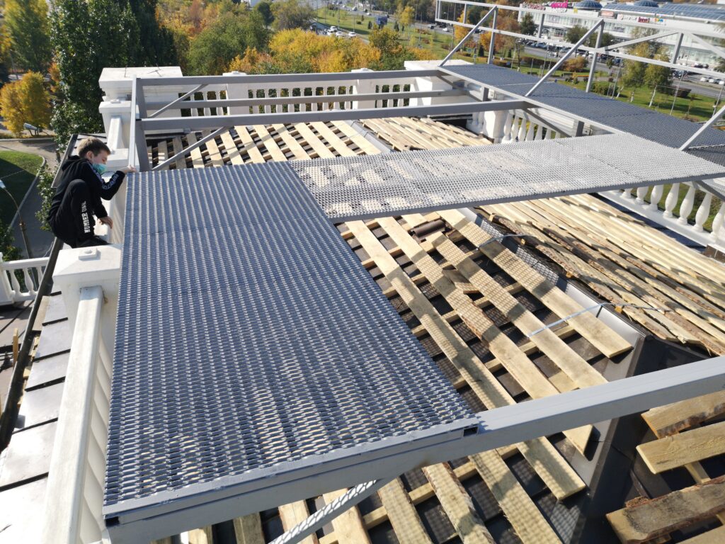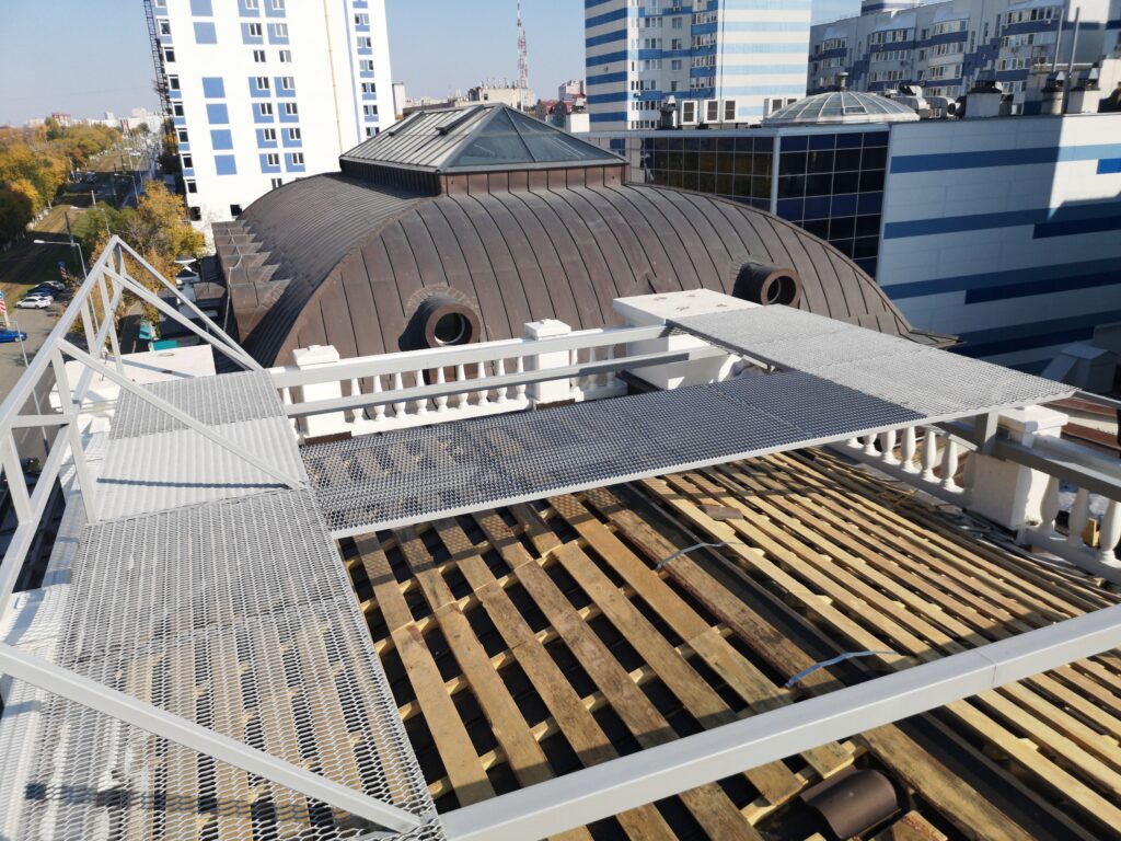 Проектирование, изготовление и монтирование крышной конструкции для нового офиса банка. Здание с очень сложной геометрией крыши, дорогостоящие материалы отделки покрытия (медная замковая кровля), фактически возникла необходимость подготовки отдельного технического уровня из металла для проведения работ на объекте. Основное время в работе было затрачено на проектирование, изготовление и монтаж опорной металлоконструкции с площадкой обслуживания и путями доступа к вывеске. Более 3 тонн металлоконструкций на объекте, производство элементов было осуществлено на производственной базе с укрупнительной сборкой на объекте.