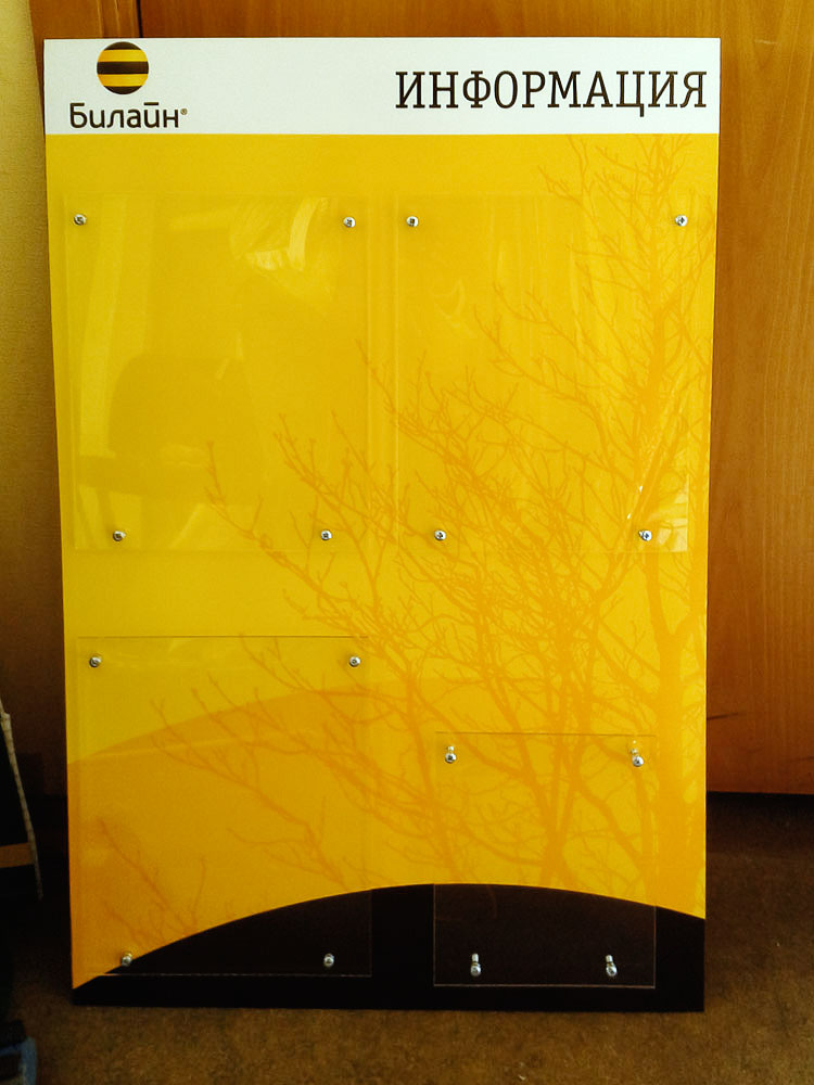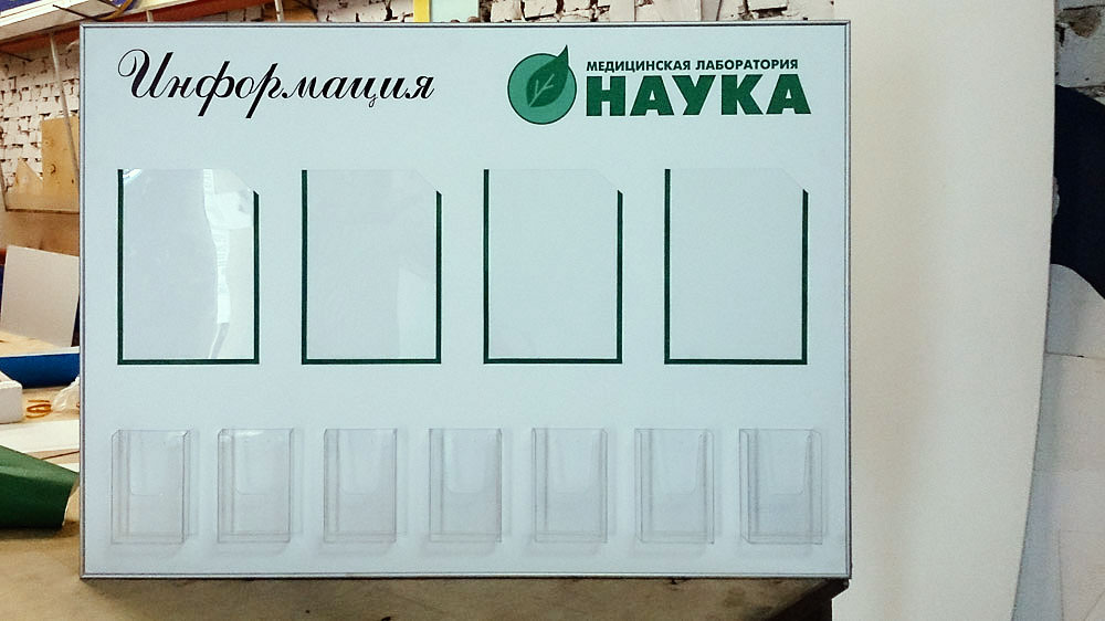- Материалы: ПВХ, акрил, прозрачные карманы различного формата, композитные подложки; возможна печать фирменного оформления и ламинация.